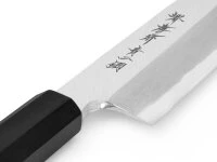 hat den Vorteil, dass man mit diesem Messer und etwas Übung sehr feine Schnitte machen kann. Sollte es an Erfahrung mit einseitig geschliffenen Messern noch fehlen, bedarf es zu Beginn ein bisschen Aufmerksamkeit, um das Messer gerade zu führen. Die Klinge ist aus Aogami 2 Kohlenstoffstahl, dem berühmten blauen Papierstahl, gefertigt. Natürlich wurde das Messer der Messerschmiede mit der Marke SAKAI TAKAYUKI von Meisterhand geschmiedet und geschliffen.