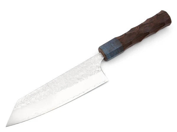Der Griff dieses außergewöhnlichen Messers besteht aus edlem Wenge-Holz, das mit „stabilize wood“ veredelt wurde. „Stabilize Wood“ ist ein Holz, das mit Acrylharz durchtränkt wurde, um seine Widerstandsfähigkeit und Haltbarkeit erheblich zu steigern. Doch nicht nur die Materialwahl, auch die Form des Griffs ist bemerkenswert. Die oktogonale Grundform wurde kunstvoll gestaltet und bietet eine Vielzahl von Griffmöglichkeiten, wodurch nahezu jede Hand den perfekten, angenehmen und sicheren Halt findet.