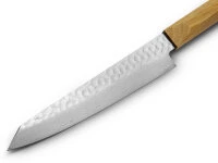 ist mit etwas mehr als 140 mm Klingenlänge ein echtes, schlankes Allzweckmesser. Die glänzend polierte Damastklinge hat ein markantes Hammering, der Griff aus starkem Eichenholz ist achteckig geformt und hat eine leichte Schräge zu Klinge hin. Insgesamt liegt das Messer sehr sicher und komfortabel in der Hand. Alle kleiner Schneidearbeiten meistert das