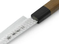 von Kanehiro Hamono, geschmiedet von Yoshimi Kato. Ein außergewöhnliches Damastmesser mit gehämmerter Damast Klinge und Ergonomie-Griff aus dem seltenen white ebony. Der Klingen-Kern besteht aus VG-10 Stahl, der mit insgesamt 34 Lagen Damast Stahl ummantelt ist. Dabei setzt Yoshimi Kato zwei unterschiedliche Sorten von Damast Stahl ein, um das optimale Härte-Flexibilität Verhältnis zu erreichen. Das ungewöhnliche Hammering der Klinge im oberen Teil ist nicht nur ein auffallendes Design-Merkmal, es hat bei Tests auch sehr gute Anti-Haft Effekte gezeigt. Die Messerform