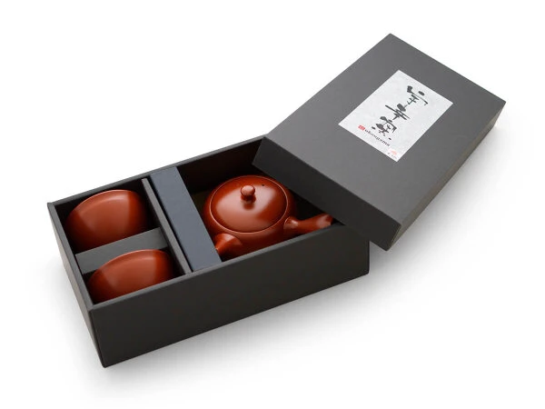 Original japanisches Teeservice mit 2 Teeschalen, direkt aus Tokoname, Japan. Echter roter Tokoname-Ton. Die japanische Grünteekanne hat ein integriertes Sieb für die einfache Handhabung und den bestmöglichen Kontakt des Wassers zum Tee. Tokoname-Ton ist besonders bekannt für seine positive Wirkung auf die Entwicklung der feinen Aromen des Tees. Der Körper des Teegeschmacks wird deutlich gefördert, Bitterstoffe absorbiert. Freuen Sie sich auf höchsten Teegenuss.